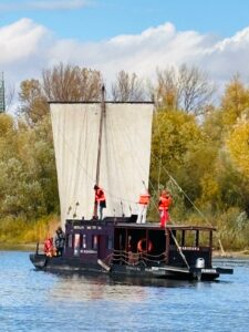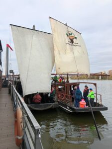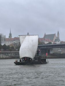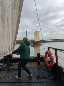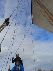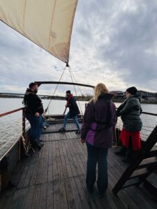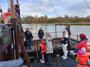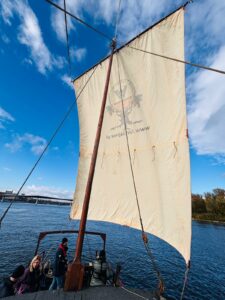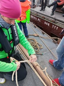 Warsztaty realizowane w październiku i listopadzie zgromadziły 76 uczestników. Jesienna aura bywała wymagająca — zdarzał się brak wiatru, pojawiały się opady — jednak nie miało to wpływu na zaangażowanie ani frekwencję. Zajęcia upływały pod znakiem uważnej pracy: stawiania żagli, sterowania wiosłem typu „drygawka” oraz nauki wiązania lin. Towarzyszyły temu skupienie, współpraca i wyraźna radość z obcowania z tradycyjnym rzemiosłem żeglarskim.
